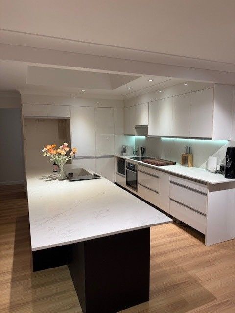 20mm Dekton by Cosentino Marina (Velvet) kitchen benchtops featuring sink cutout and drop-in hotplate cutout and 20mm grain matched splashback. Manufactured and installed by Redcliffe Stone Benchtops.