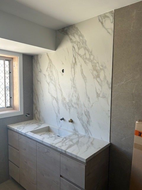 12mm Porceluxe by Designer Surfaces - Calacatta Gold - matte 40mm mitred and grain matched integrated vanity benchtop and 12mm grain matched splashback. Featuring taps out of the wall and hole cutout for vanity mirror.
