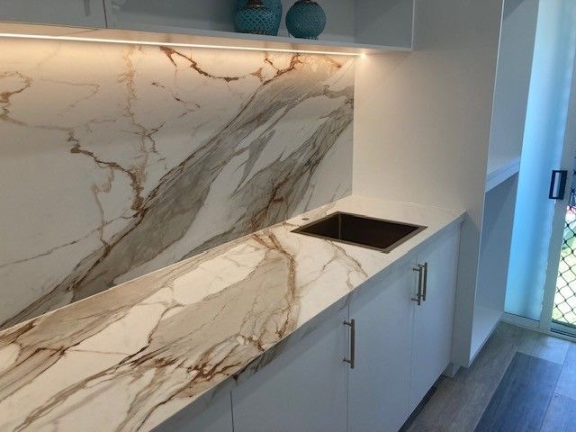 12mm Porceluxe by Designer Surfaces - Macchia Vecchia Gold (Matte) laundry benchtop featuring 40mm mitred edge and drop-in tub cutout. Along with 12mm matching splashbacks. Manufactured and installed by Redcliffe Stone Benchtops.